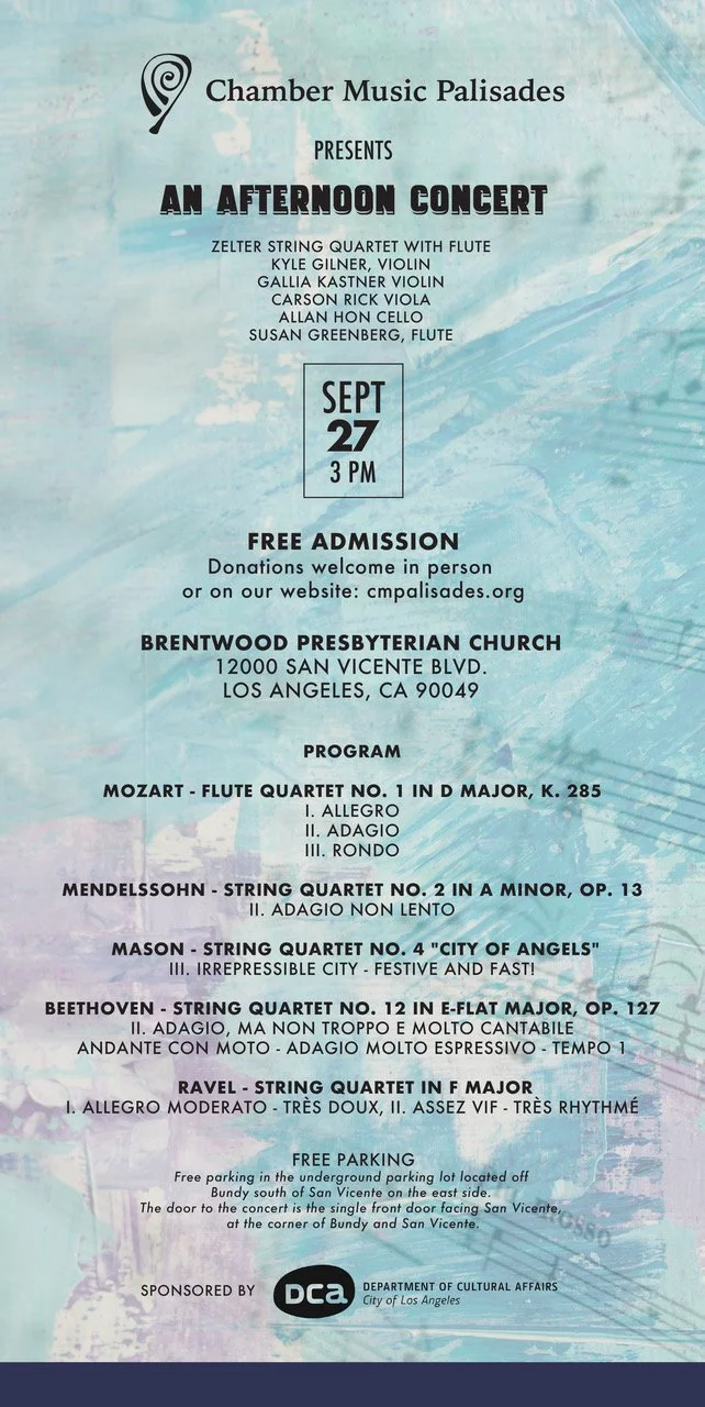 Dec 3 Flute and Strings Wednesday, December 3, 2025 7:30 PM 9:00 PM Google Calendar ICS Chamber Music Palisades: Flute and Strings View Event → Feb 4 Duos and Trios Wednesday, February 4, 2026 7:30 PM 9:00 PM Google Calendar ICS Chamber Music Palisades: Duos and Trios View Event → Apr 15 Piano Night Wednesday, April 15, 2026 7:30 PM 9:00 PM Google Calendar ICS Chamber Music Palisades: Piano Night View Event → Oct 8 New Hollywood String Quartet Wednesday, October 8, 2025 7:30 PM 9:00 PM Google Calendar ICS New Hollywood String Quartet with Susan Greenberg, flute View Event → Sep 27 An Afternoon Concert Saturday, September 27, 2025 3:00 PM 4:00 PM Chamber Music Palisades (map) Google Calendar ICS Zelter String Quartet with Flute View Event →